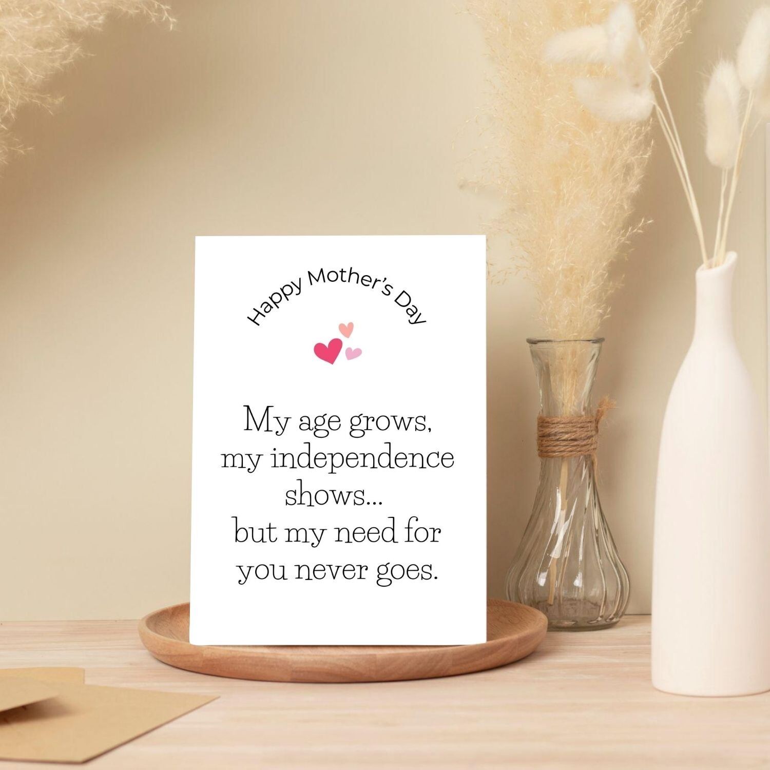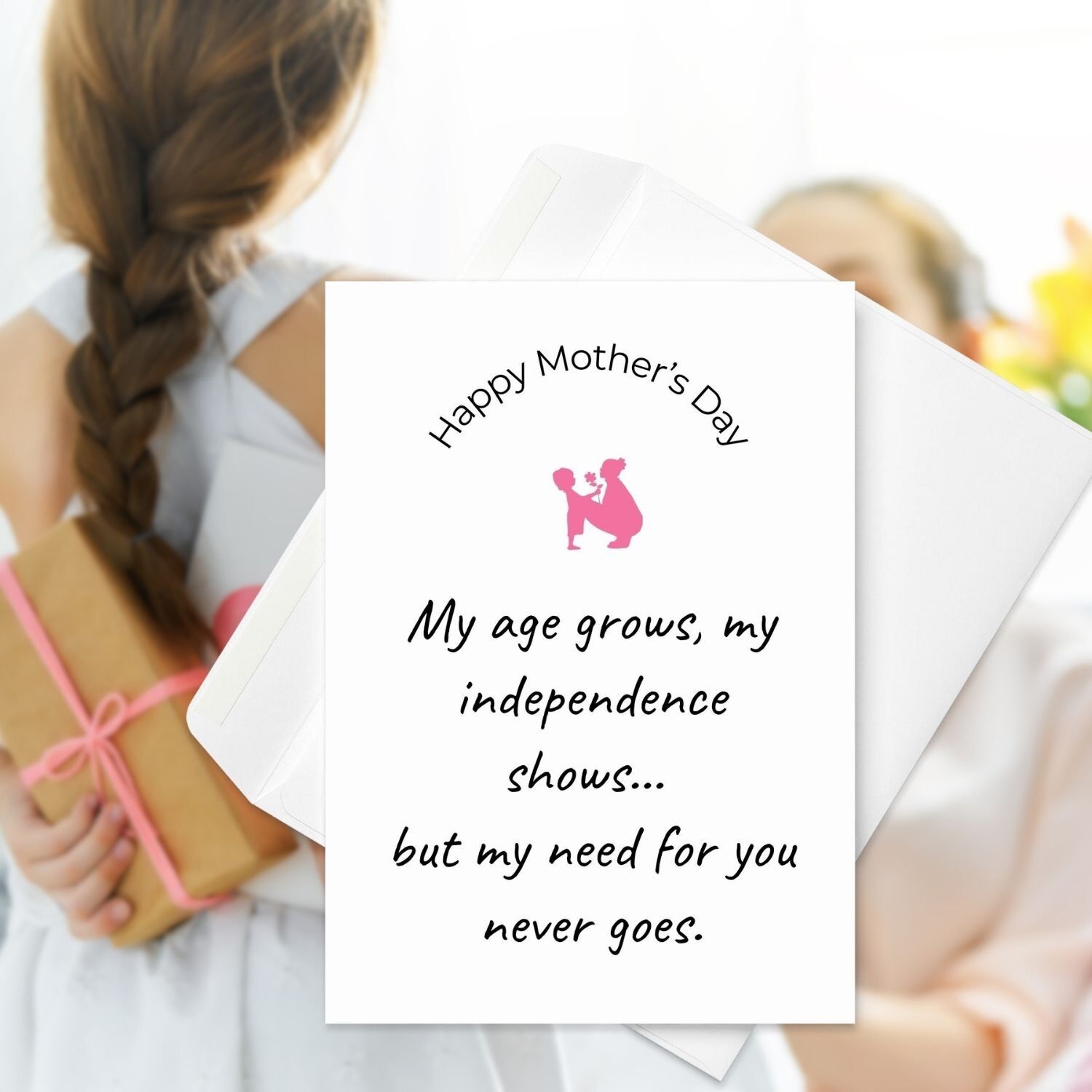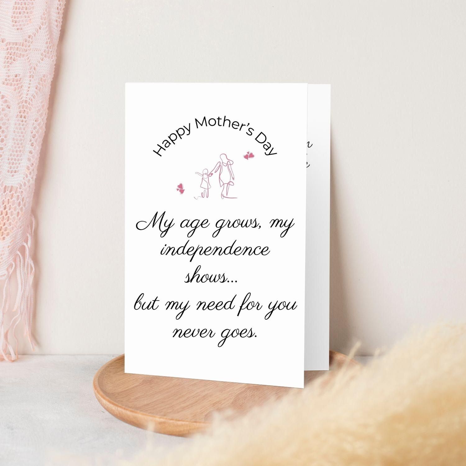Growing Up, Never Growing Apart For every mom who’s been your forever anchor, this Mother’s Day card lets you choose the perfect visual love letter. Select from 5 tender designs, each paired with the poignant message: “My age grows, my independence shows, but my need for you never goes.