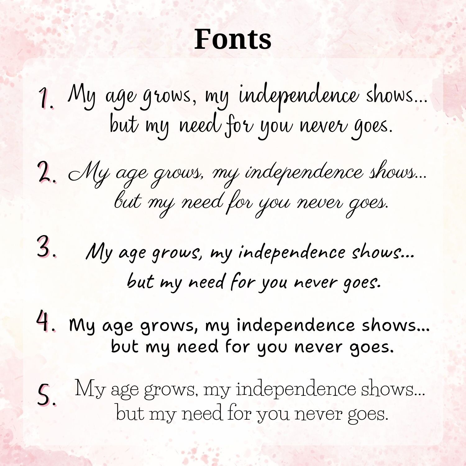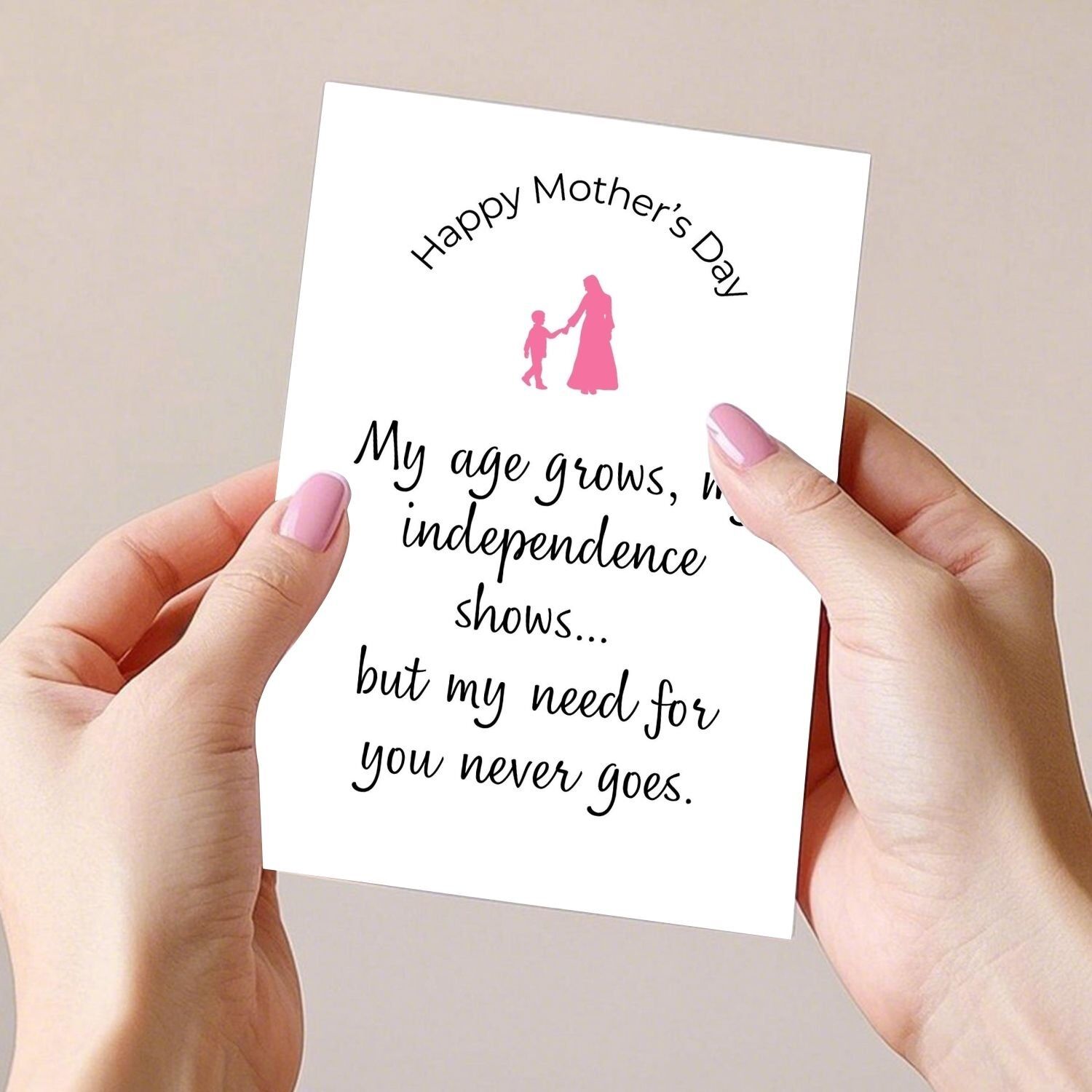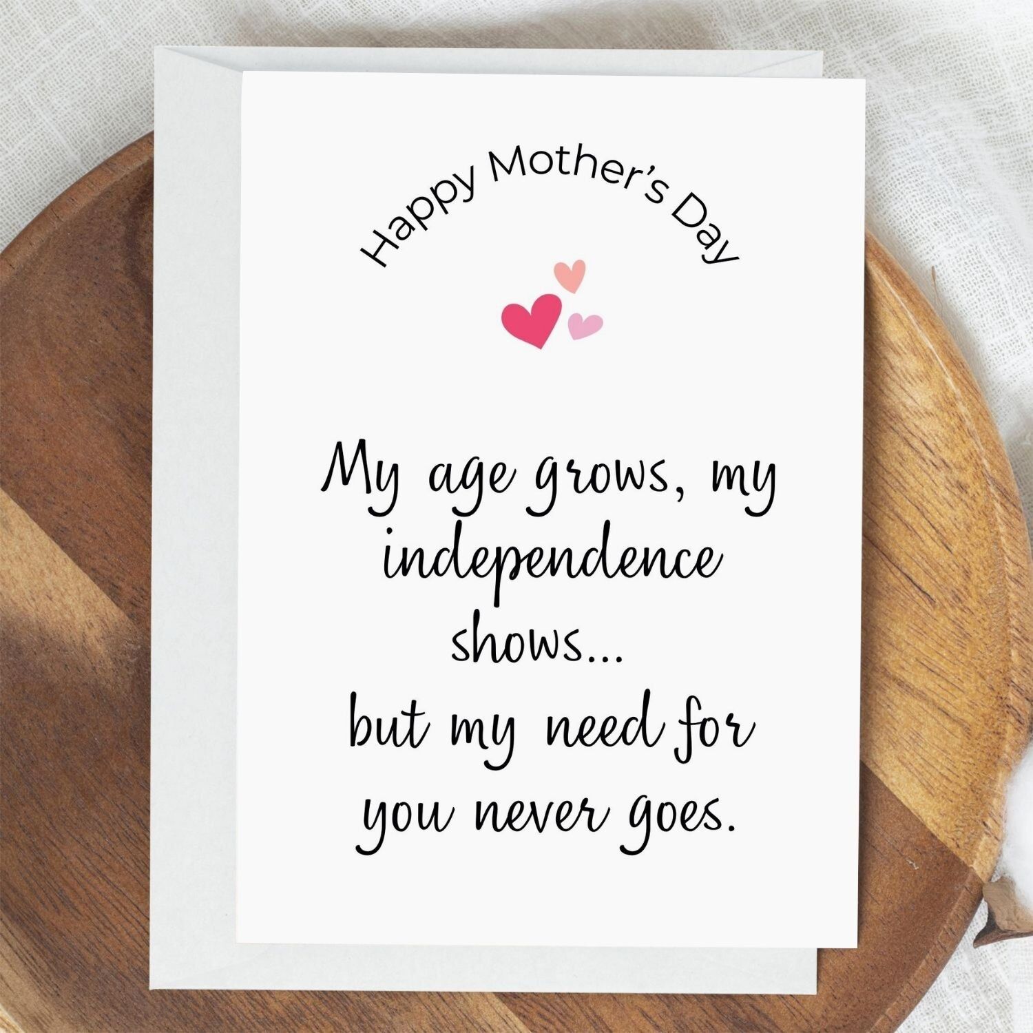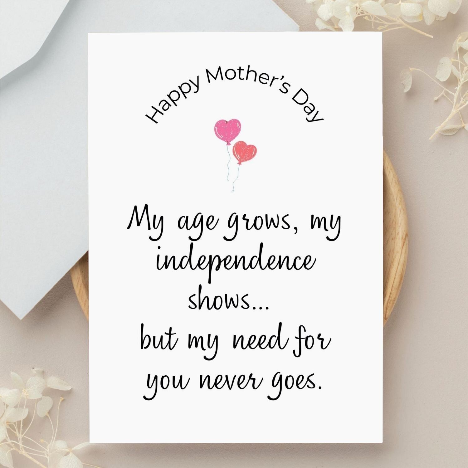 Growing Up, Never Growing Apart For every mom who’s been your forever anchor, this Mother’s Day card lets you choose the perfect visual love letter. Select from 5 tender designs, each paired with the poignant message: “My age grows, my independence shows, but my need for you never goes.